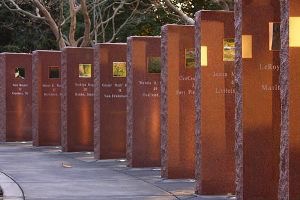 Each individual's name, age, and hometown is engraved on each stone. On the front side of the 40 stones is a polished stainless steel mirror to reflect the viewers own image to signify that it could have been any one of us aboard Flight 93 that day. The back of the 40 remembrance stones were left unfinished to signify that the heroes had unfinished lives. The stones begin at the "Circle of Remembrance", with two boards describing the Flight and the Memorial, and one board with the names of the Sponsors and Donors. The flowing path leads the visitor to each stone and allows them to step off the path and individually reflect and pay respects to that person. There are also "reflection benches" along the path so that visitors can take time to sit and reflect about the loss we have all felt and the grief the World, the Nation and the Families have endured since that fateful date in history. Bordering the benches are grasses symbolizing amber waves of grain. Other flowers are planted along the path and around the Memorial to illustrate rebirth and hope for the future. The Memorial ends at the "Circle of Hope." This circle has and American flag symbolizing the bravery and courage of those citizens that day. The flag is surrounded by a circle of tiles hand painted by children from the community, these tiles show their vision of the future.