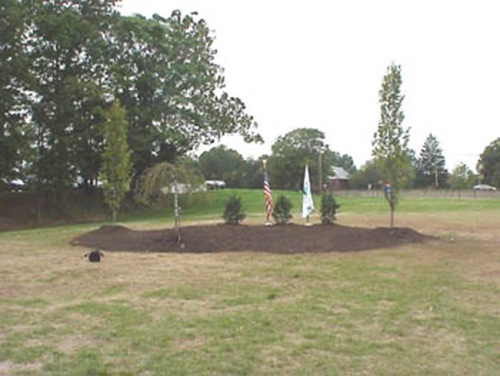 This garden and trail has been built as a reminder of what took place on 9/11. Entering the memorial from the driveway you walk through a trail of hanging plants. There are 99 poles in the garden. (9 x 11 = 99). Names of everyone killed on September 11 are on the poles. The names on the poles are not in alphabetical order. They are in random order, showing each person as an individual. You can find a person's name and where they are located in the garden in the box at the beginning of the trail. The rock sculpture honors those killed at the Pentagon. There are 254 rocks outlining the sculpture. September 11 is the 254th day of the year. Walking around the trail there are 9 benches, again representing the month of September.