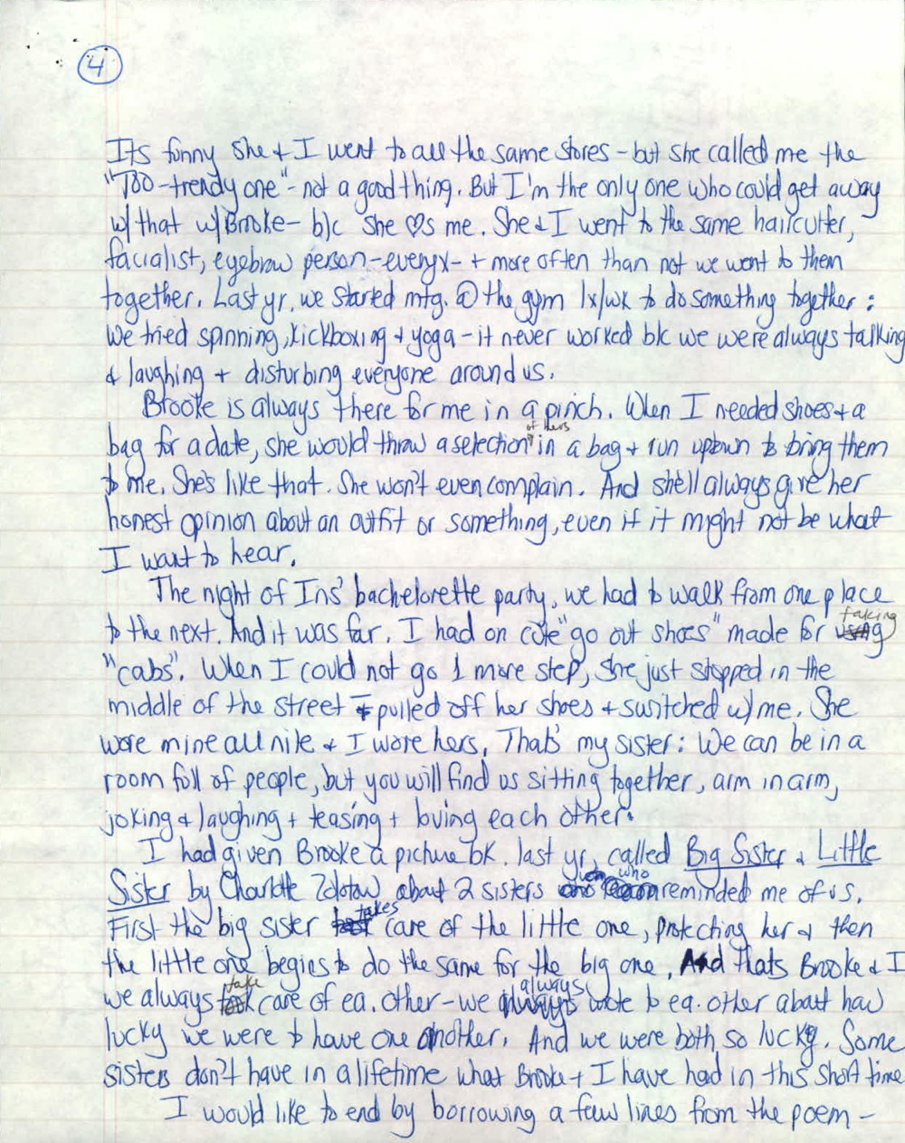 She had a nonchalant selflessness about her, the type of altruism that immediately attracted people to her. She never judged, but always listened, with both with her ears and her heart. She never denied help to those who asked and often gave it to those who didn't. She could light up a room with her smile and show you that things were never as bad as you thought they were. Brooke had the ability to succeed in any endeavor no matter how difficult but always remained modest and humble. She was a voracious reader, reading almost a book each day. Every night she would stop by Borders Bookstore in her Kips Bay neighborhood always recognizable with her trusted backpack and water bottle.