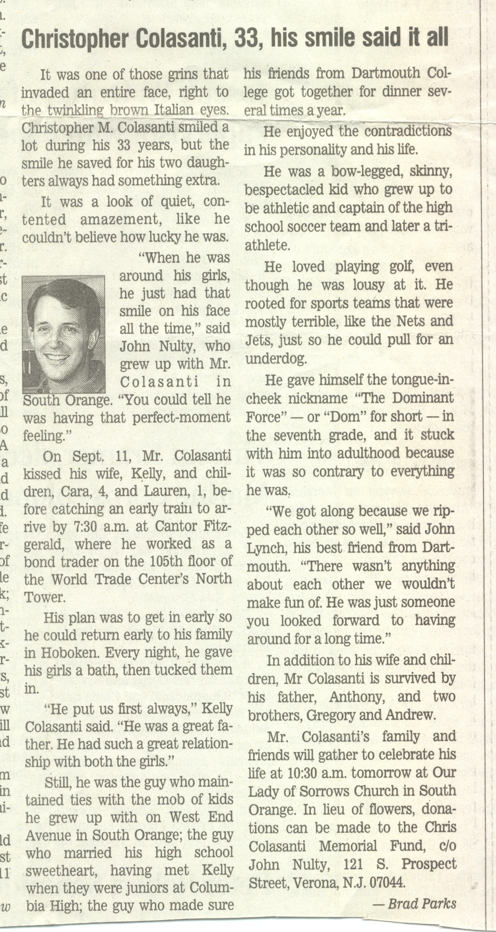 It was one of those grins that invaded an entire face, right to the twinkling brown Italian eyes. Christopher M. Colasanti smiled a lot during his 33 years, but the smile he saved for his two daughters always had something extra on it.