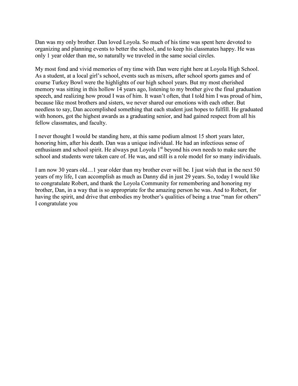 Daniel Walker McNeal was born March 25, 1972 in Towson MD. He was the son of Michael S. and Kathryn W. McNeal. At the age of twelve, Dan began his Jesuit education at Loyola Blakefield in Towson MD. He was class president for five years and he became Student Government President in his senior year. A member of the National Honor Society, Dan was gifted in public speaking. In his senior year he was a national contender in the area of extemporaneous speaking. Dan’s life motto being “A Man for Others” was introduced to him while at Loyola. In 1990, Dan began his college career at Boston College. After three and a half years, he received his BS Degree in Business Administration, concentrating in the area of finance. He graduated Cum Laude. For several years, he was employed at Riggs Bank in Washington DC. In 1998, he attended Georgetown University where he received his MBA Degree in 2000. He graduated Magna Cum Laude. Leaving Georgetown, Dan moved to New Jersey and was employed by Sandler O”Neill and Partners. He was an Analyst in Equity Research and later became Vice President. Sandler O’Neill was located on the 104th floor of Two World Trade Center. Presently, there is a scholarship fund established in Dan’s memory at Loyola Blakefield. The qualification for the senior receiving the scholarship is that he must exemplify the Jesuit tradition of being a “Man for Others” At Georgetown University, there will be a room dedicated to the memory of Daniel Walker McNeal. This room will be located in the future McDonough School of Business building located on the Campus of Georgetown. Dan was to walk his sister Kathleen down the aisle at her wedding just 2 weeks after September 11, 2001, in place of her terminally ill father. Needless to say Dan did not make the wedding. His father was buried on Christmas, 2001